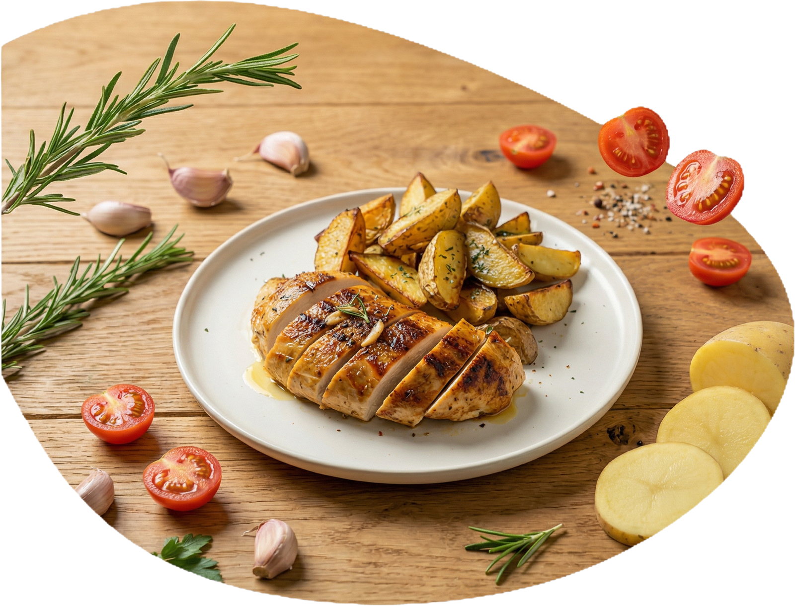 Un classique revisité pour votre bien-être. Notre blanc de poulet grillé, accompagné de pommes de terre rôties aux herbes de Provence, vous offre 45 g de protéines pour seulement 531 kcal.
